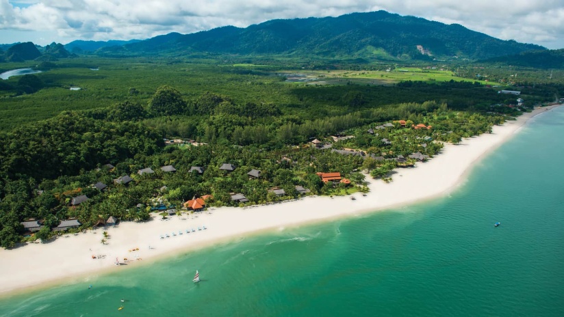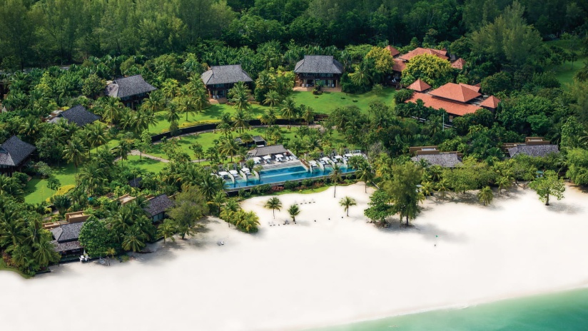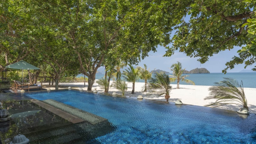 Пляжная семейная вилла с 1 двуспальной и 2-мя односпальными кроватями, ванная комната с ванной, душевой кабиной, гардеробной и тропический душ на открытом воздухе, гостиная зона отделена стеллажной перегородкой, меблированная терраса с обеденной зоной на 4 персоны, шезлонги, частный бассейн (12 м²), сад, искусственные пруды, пляжный гамак, выход на пляж, вид на море; гостям предоставляется трансфер из аэропорта и обратно и 1 бесплатный напиток из мини-бара по прибытии; план номера;