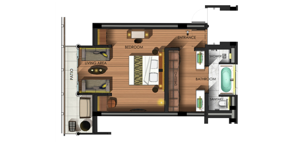 Номер в главном здании со спальней и гостиной зоной, 2-3 этаж: двуспальная кровать king-size или 2 односпальные кровати; письменный стол, туалетный столик, 2 дивана, отдельная ванная комната с душевой кабиной, ванной, двойной раковиной и гардеробной зоной, меблированный балкон, вид на тропический лес, план номера;