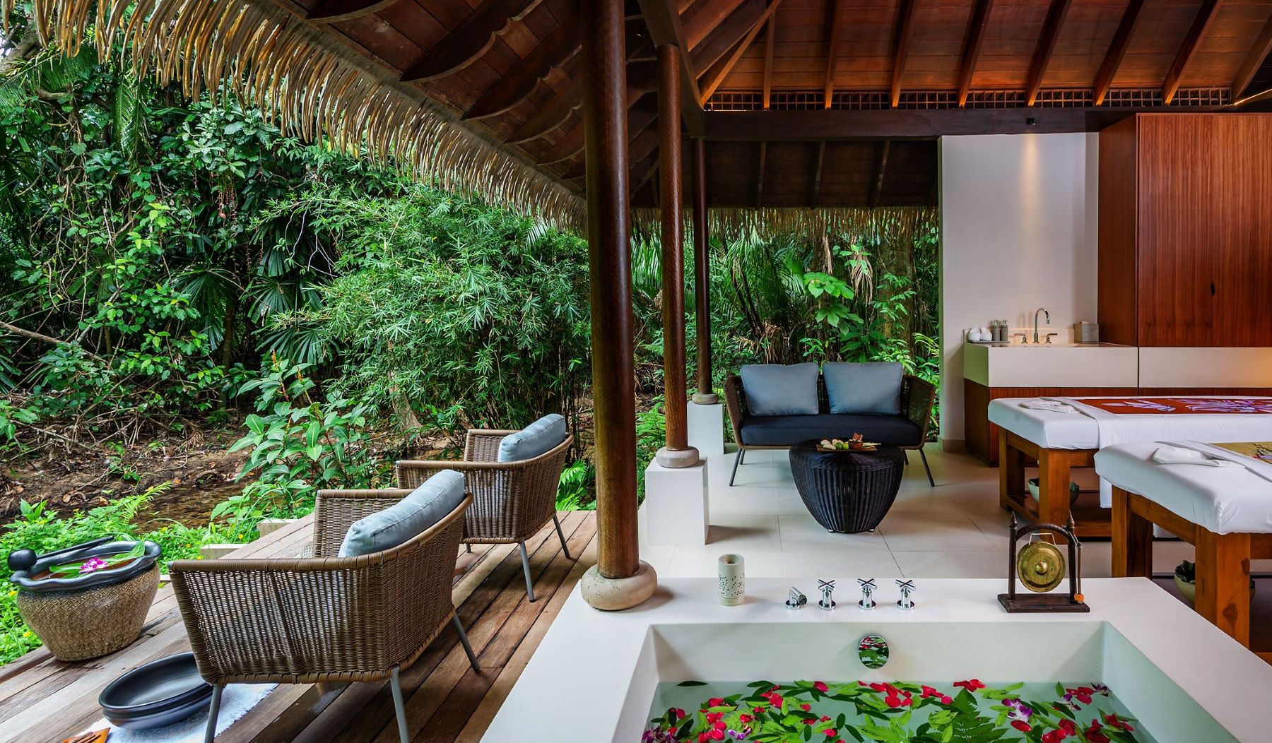 * предлагается спектр бесплатных услуг: трансфер из аэропорта, ежедневно пополняемый мини-бар с напитками, закусками и миниатюрными бутылочками крепких напитков (за исключением вин из винного холодильника), ежедневный послеобеденный чай (для гостей вилл The Datai Estate и вилл на берегу/ Beach Villa также завтрак по меню в The Beach Club или с доставкой на виллу), круглосуточное обслуживание дворецким.