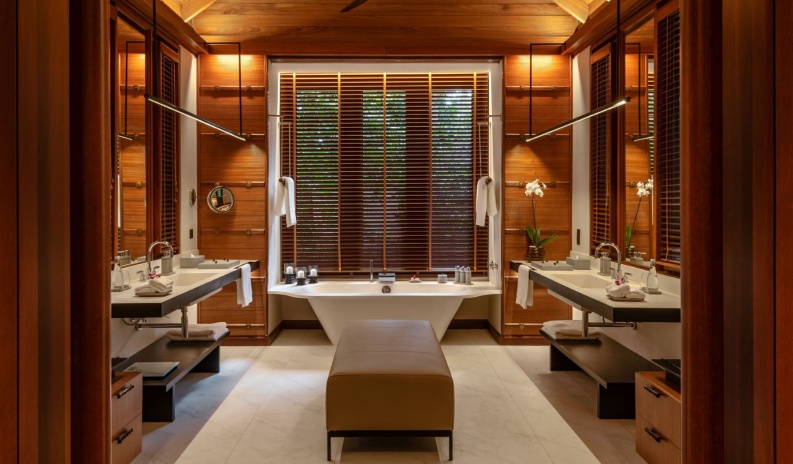Вилла с 1 спальней с на берегу: спальня с двуспальной кроватью и кушеткой, ванная комната с дизайнерской ванной, душевой кабиной, двойной раковиной, гардеробной, отдельная гостиная с высокими деревянными потолками, окнами от пола до потолка, диваном и обеденным столом на 4 персоны, подсобное помещение/ кухня для дворецкого, меблированная терраса с открытым персональным бассейном (10 м²), сад, выход к пляжу, привилегии для проживающих в номере*, план виллы;