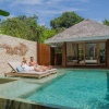 Расположены на пляже, спальня с двуспальной кроватью king-size, спальная зона с 2 отдельными кроватями (нет межкомнатной двери между спальными зонами), ванная комната с душем, душ и ванна на открытом воздухе, терраса с открытым персональным бассейном, обеденной зоной, качелями и лежаками, план номера;