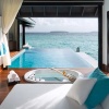 Расположены на сваях над водой, двуспальная кровать king-size, ванная комната с гидромассажной ванной со стеклянным дном и душем, терраса с частным бассейном, обеденной зоной, гамаками и лежаками и лестницей, ведущей в океан, план номера;