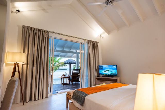 Виллы частично расположены над водой, двуспальная кровать king-size, диван-кушетка, ванная комната с ванной и душем, душ под открытым небом, меблированная терраса, спуск в воду с террасы, расположены в северной части острова, см.план номера. При размещении 2 взрослых + 2 ребенка может быть предоставлена одна дополнительная кровать и диван.