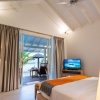 Вилла частично расположена над водой, спальня с двуспальной кроватью king-size, отдельная гостиная комната с диваном, обеденным столом и мини-кухней, ванная комната с ванной и душем, тренажёр – беговая дорожка, меблированная терраса, небольшой персональный бассейн, спуск в лагуну, вид на океан, план номера;
