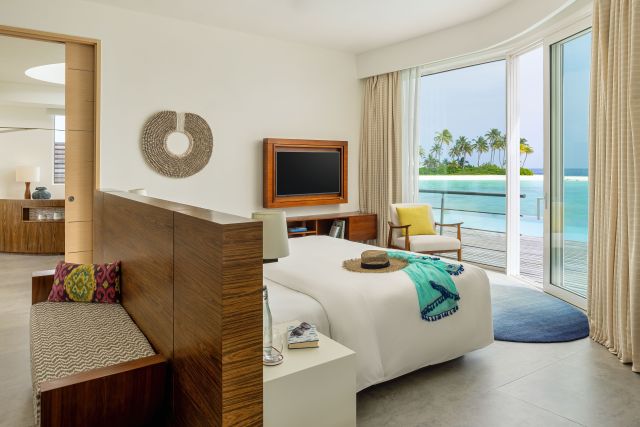 Расположены на сваях над водой, 2 спальни: двуспальная кровать king-size и 2 односпальные кровати, 2 ванные комнаты с ванной, 2 душа под открытым небом, гардеробная, отдельная гостиная комната с диваном, гостевой туалет, меблированная терраса с лежаками и персональным бассейном размера 14,3 х 4,2 х 1,2 м, меблированная терраса на крыше, вид на океан, прямой спуск в воду, см.план номера, план террасы на крыше;