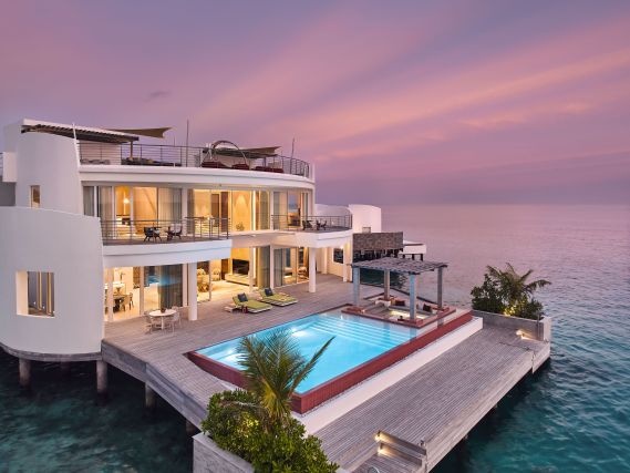 Расположены на сваях над водой, двухуровневый номер, 3 спальни: 2 двуспальные кровати king-size и 2 односпальные кровати, кабинет, отдельная гостиная комната с диваном, обеденным столом и мини-кухней, гостевой туалет, гардеробные и ванные комнаты, комната с тренажёрами, паровая баня, сауна, терраса, 2 душа под открытым небом на террасе, частный бассейн размера 18 х 6,3 х 1,2 м, меблированная терраса на крыше, прямой спуск в воду, вид на океан см.план номера 1 этаж, 2 этаж, 3 этаж.