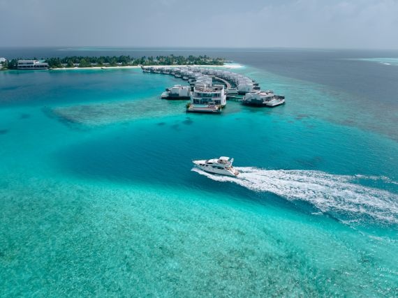 Расположены на сваях над водой по обе стороны острова, спальня с двуспальной кроватью king-size, отдельная гостиная комната с диваном, гардеробная, ванная комната с ванной, душем, внутренним двориком и душем под открытым небом, гостевой туалет, терраса с частным бассейном размером 7х3,5х1,2 м, душ на террасе, меблированная терраса на крыше, прямой спуск в воду, панорамный вид на океан, см.план номера, план террасы на крыше;