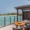 Водная вилла, двуспальная кровать king-size или 2 односпальные кровати, гостиная зона с диваном-софа, ванная комната с ванной и душем, меблированная терраса, прямой спуск в лагуну, вид на океан и восход, план номера;