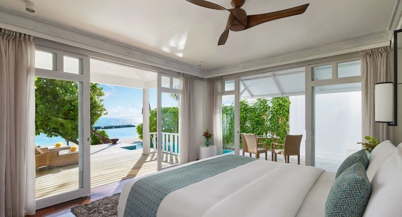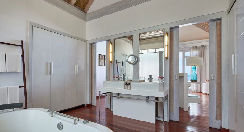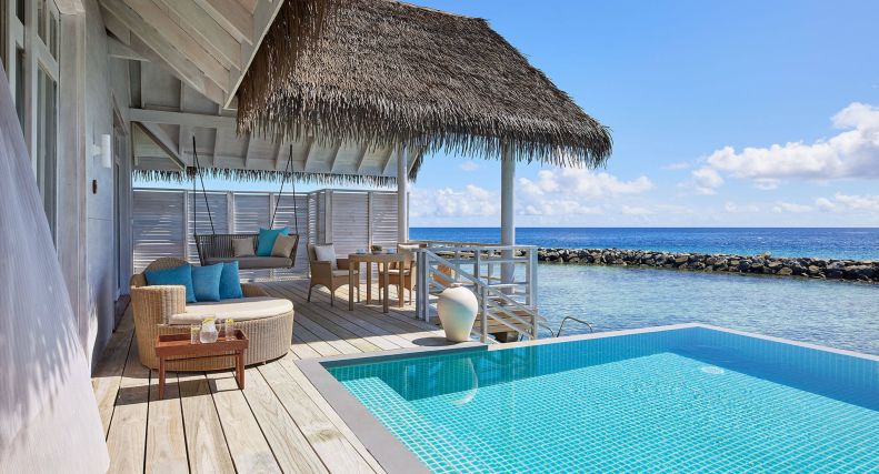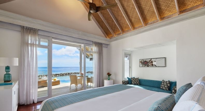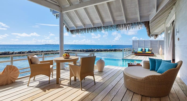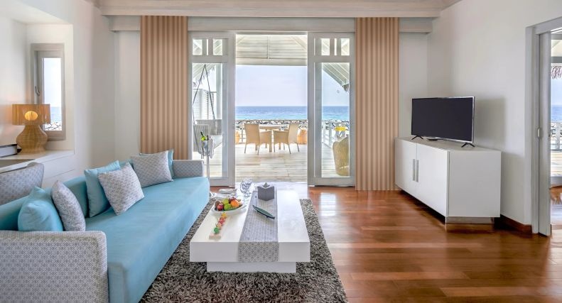 Надводная вилла, спальня с двуспальной кроватью king-size, отдельная гостиная комната с диваном-софа, ванная комната с гидромассажной ванной и душем, гостевой туалет, летний душ, терраса, частный бассейн, вид на океан.