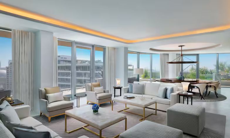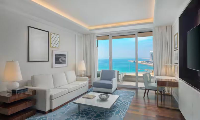 Спальня с двуспальной кроватью king-size, гостиная комната с диваном и обеденным столом, окна от пола до потолка, ванная комната с ванной и душем, гостевой туалет, гардеробная, балкон площадью 50 м² изогнутой формой предлагая зону для отдыха с видами на Аравийский залив;
