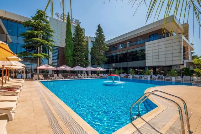 В отеле есть 2 бассейна с игровой зоной, спа-центр с турецкой и финской саунами, водные горки и тренажерный зал.