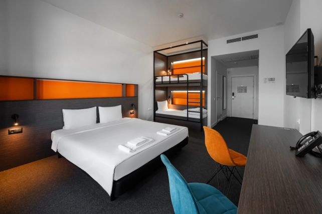 В номерах: рабочая зона, кондиционер, холодильник, телевизор, Wi-Fi, сейф, средства гигиены, фен, набор для приготовления чая и кофе, тапочки.