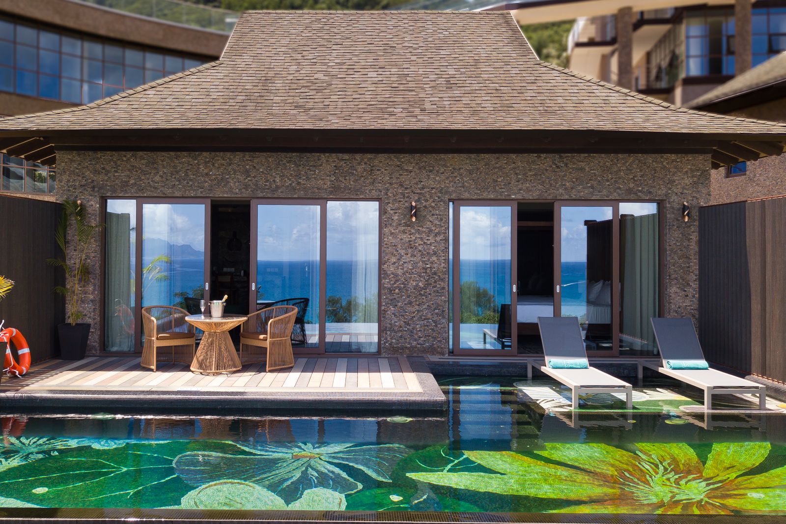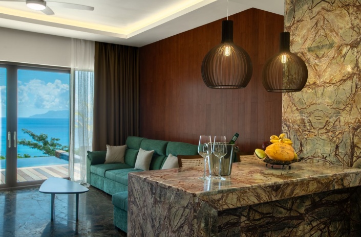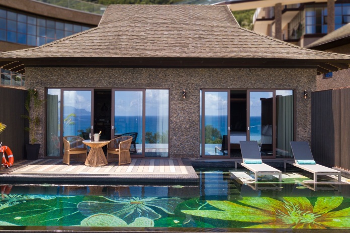 Каждая вилла носит имя уникального цветущего растения, родного для Сейшельских островов, спальня с двуспальной кроватью king-size, просторная гостиная комната, кухня, ванная комната частный 9-метровый бассейн, вид на океан.