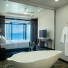 Номера сгруппированы в корпуса по 8 номеров в каждом; двуспальная кровать king-size, ванная комната с ванной, душем и панорамным окном, терраса, прямой вид на океан и тропический сад;