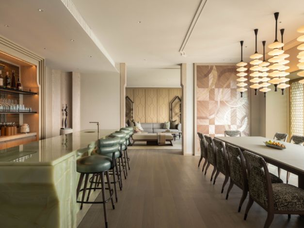 Расположен на 8 этаже, спальня с двуспальной кроватью king-size, гостиная комната с диваном, обеденным столом и кухонным уголком, ванная комната с ванной и душем, открытая терраса площадью 300 м² оснащена джакузи, шезлонгами и зоной для обедов на свежем воздухе, привилегии клуба;