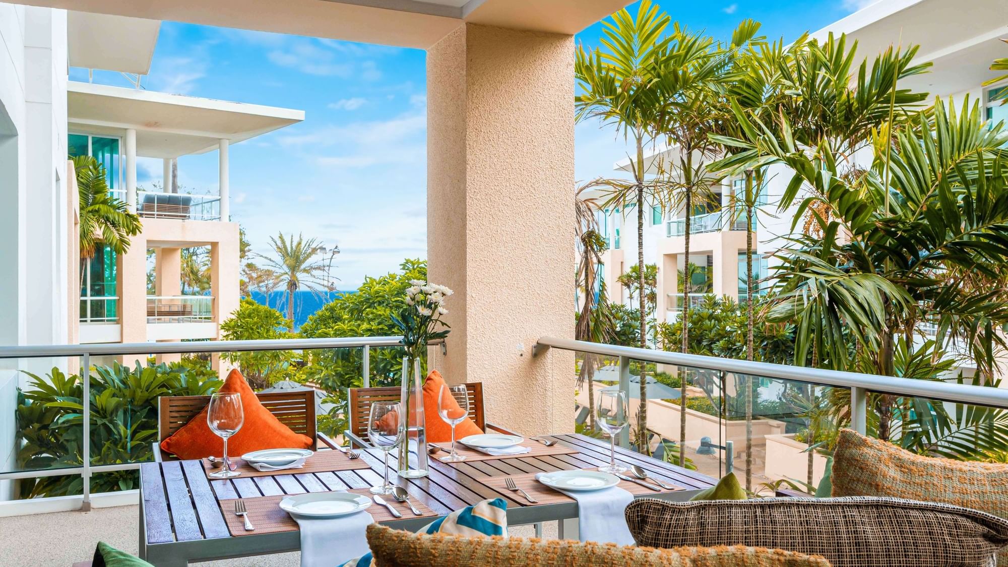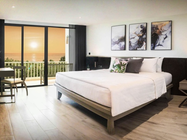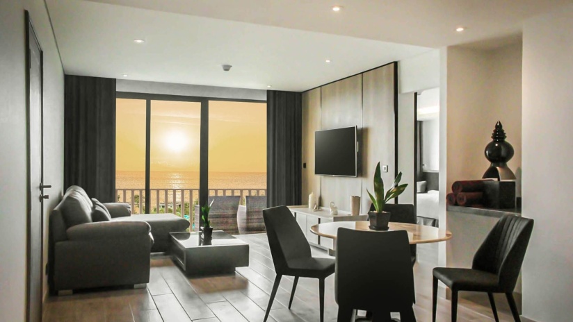 Расположены в первом ряду на территории отеля по отношению к пляжу, 2 спальни: одна с кроватью king-size и другая с 2 односпальными кроватями, 2 ванные комнаты (одна с ванной и душем, вторая только с душем), полностью оборудованная мини-кухня, совмещённая с гостиной и обеденной зоной, балкон,  эксклюзивный доступ к инфинити-бассейну с видом на пляж Карон и закат;