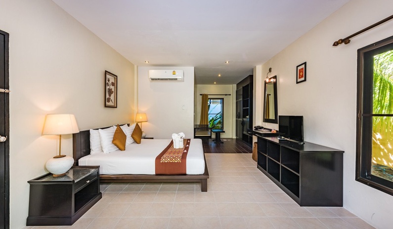 Номера-бунгало в тропическом саду, двуспальная кровать king-size или 2 односпальные кровати,  гостиная зона со скамейкой-кушеткой, ванная комната, балкон, вид на сад;