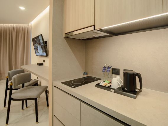 В номерах: Wi-Fi, кондиционер, сейф, фен, халат, телевизор со спутниковыми каналами, тапочки, письменный стол, банные принадлежности. На кухне: кофеварка/чайник, кухонные принадлежности, электрическая плита, столовая посуда, микроволновая печь, столовые приборы, холодильник с морозильной камерой, бутилированная вода.