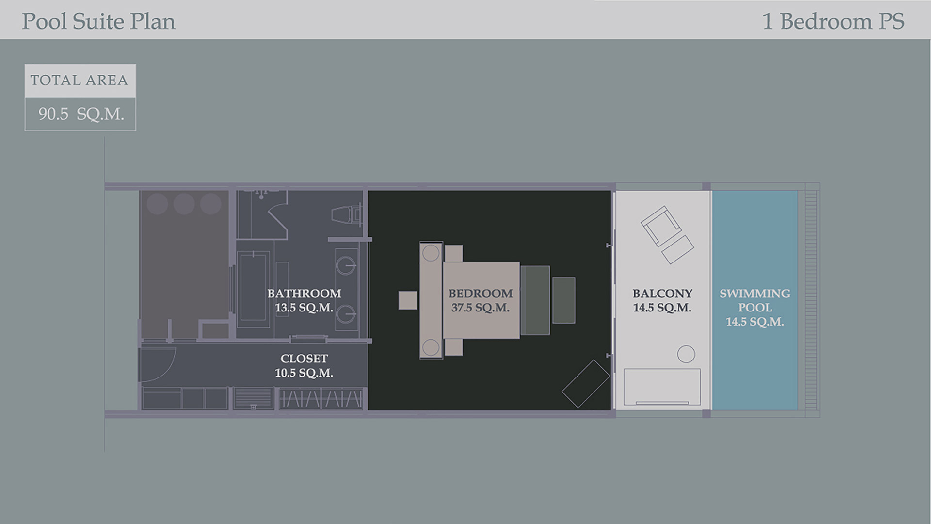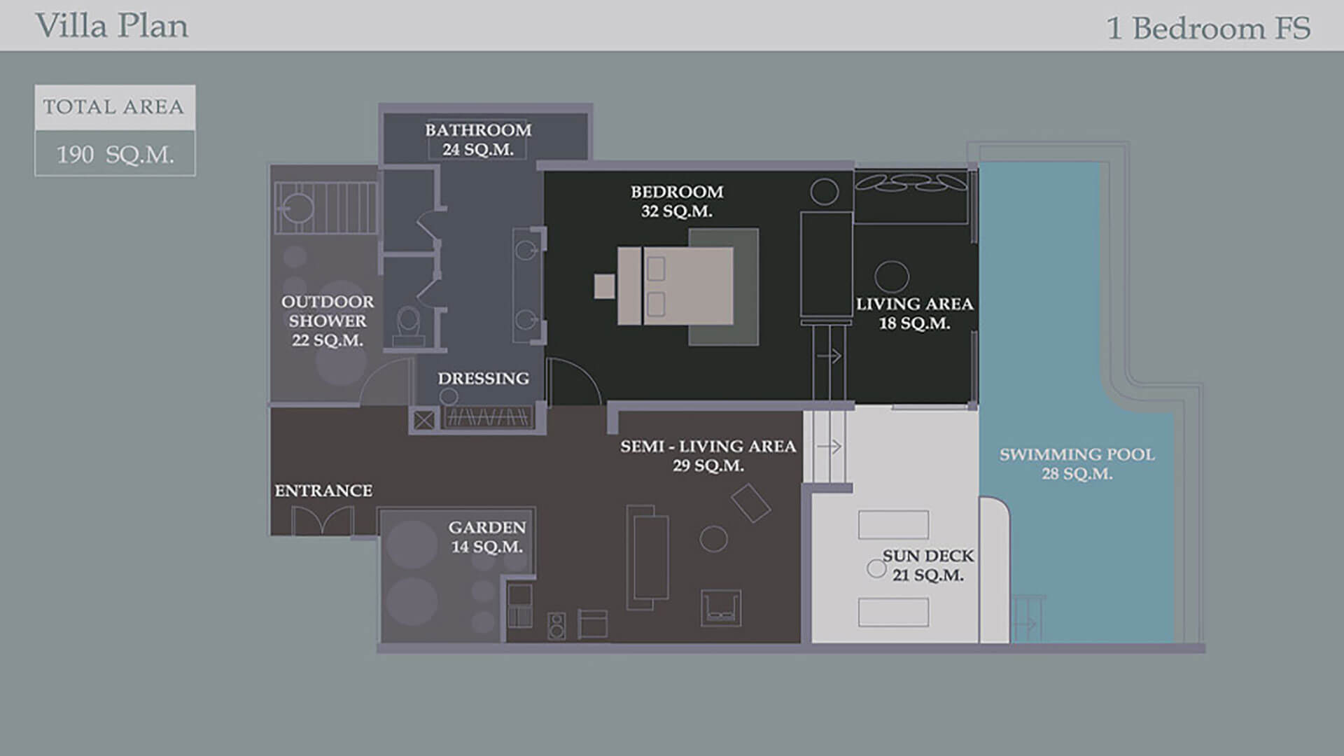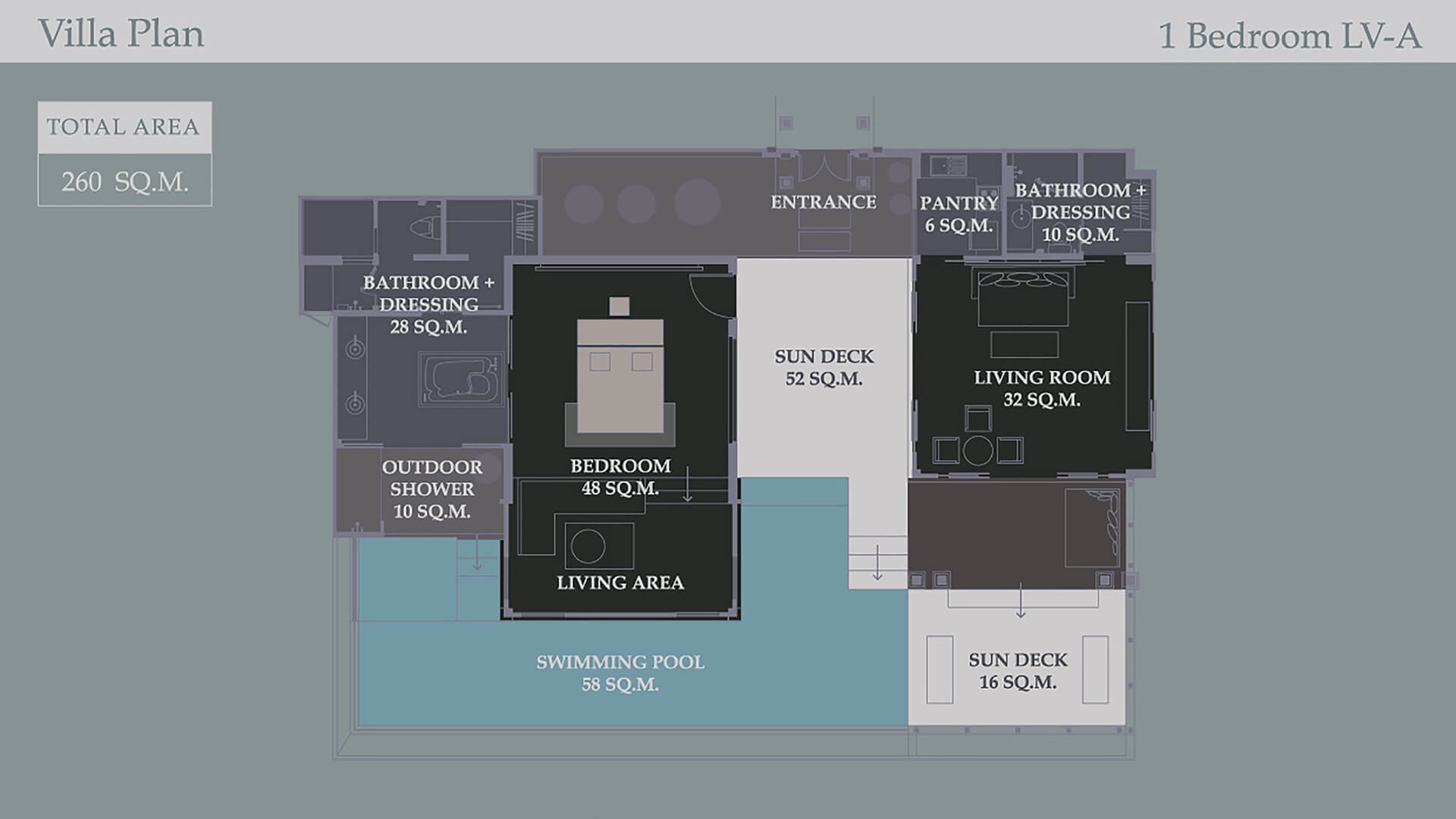 Type A: спальня, гостиная комната с кухонным уголком, особенностью виллы является солнечная терраса, расположенная между спальней и гостиной,  2 ванные комнаты, гардеробная, душ под открытым небом, терраса, персональный бассейн, вид на океан, план номера;