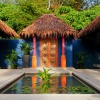 2 спальни, ванная комната и отдельный душ на открытом воздухе. Спальни разделены открытой гостиной зоной с кухней, обеденной зоной, большой раскладной софой, лежаками и бассейном, вид на сад;