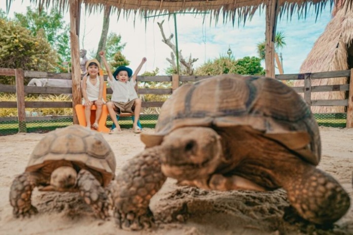 На территории — четыре просторных бассейна, включая бассейн с водными горками и баром у воды, уютные зоны для отдыха и купания, а также контактный зоопарк Animal Village, где гости могут познакомиться с дружелюбными животными — кроликами, козами и даже 40-летней черепахой.