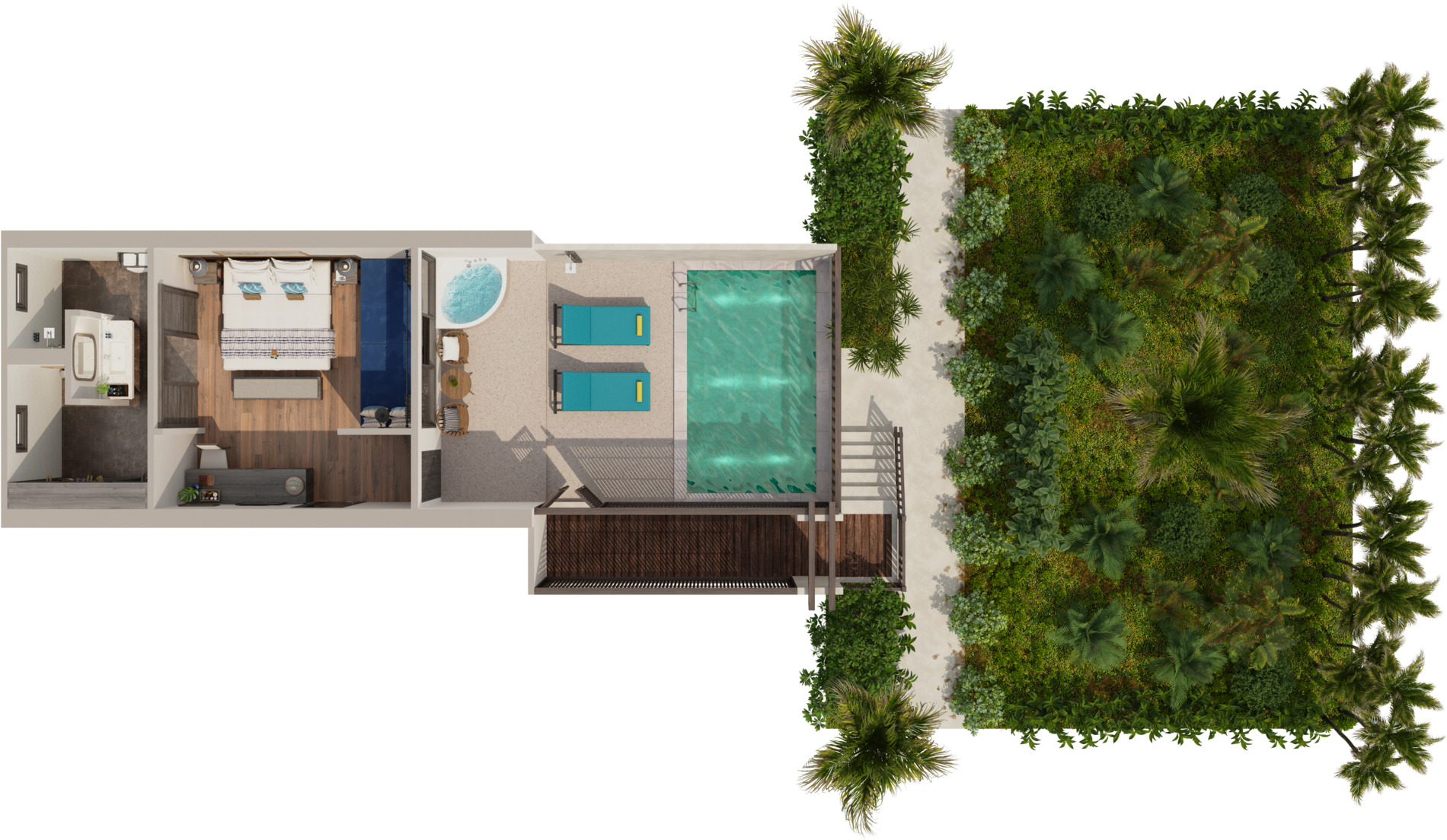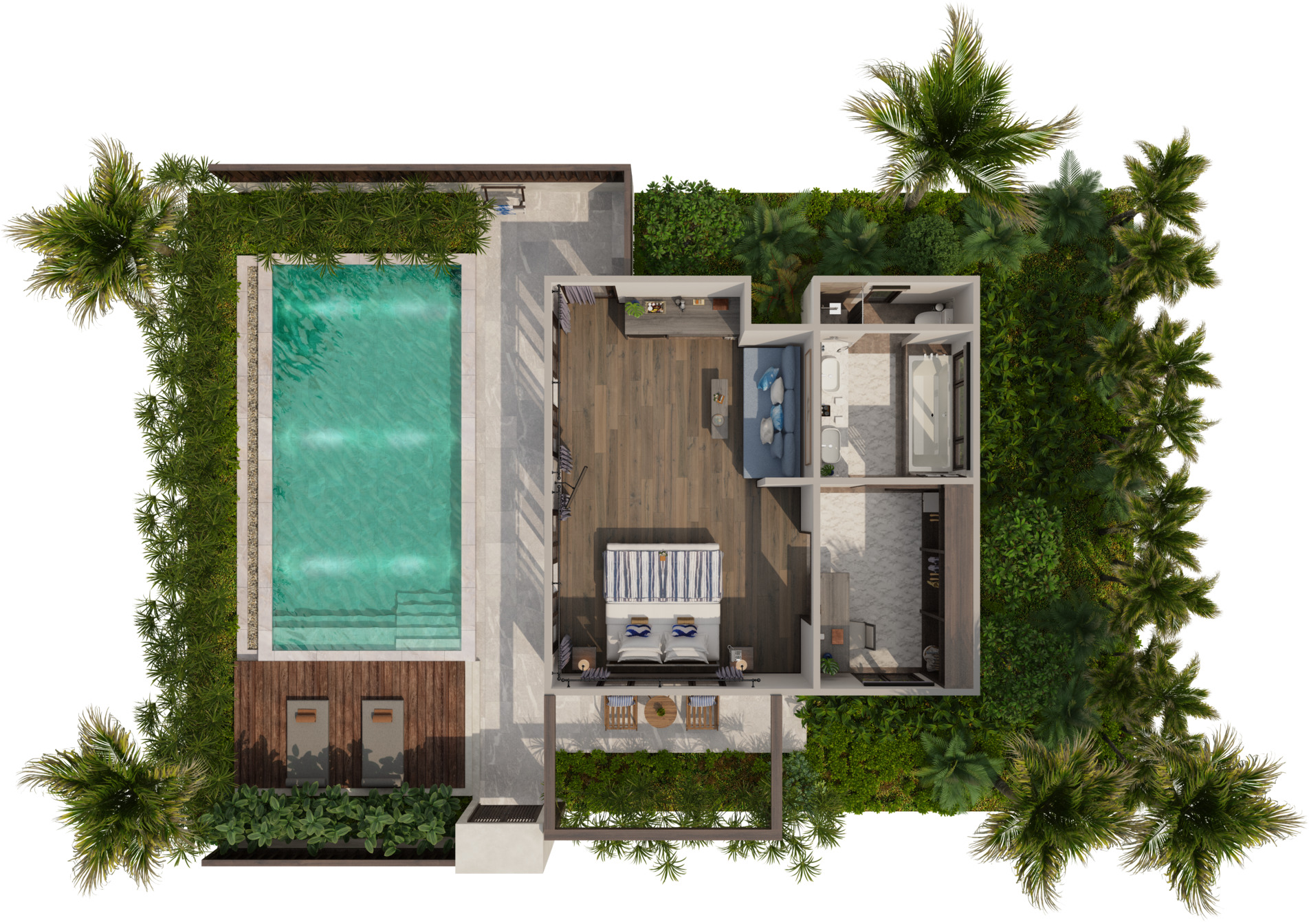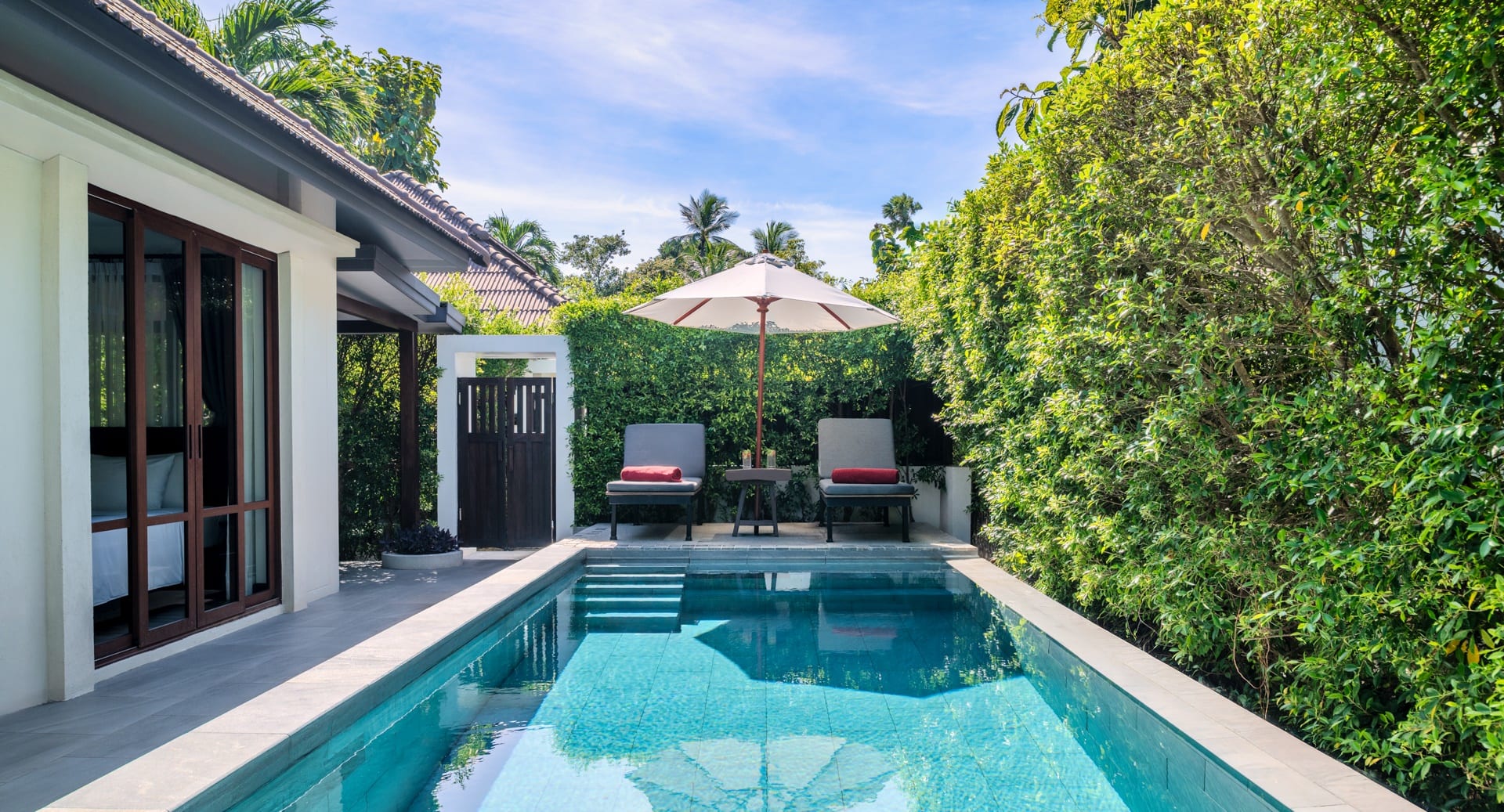 Отдельная вилла с 2-мя спальнями и межкомнатными дверьми: спальня с двуспальной кроватью, собственной ванной комнатой с душем, ванной и гардеробной; спальня с 2-мя односпальными кроватями с собственной ванной комнатой с душем; гостиная с диваном, кофемашина, терраса и дворик с частным бассейном, шезлонги, зонт, душ на открытом воздухе;