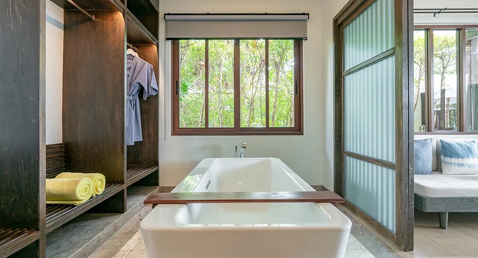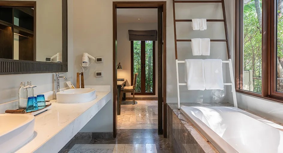 *в части номеров, сьютов и на виллах гардеробная комната/ шкаф-гардероб располагается в зоне ванной комнаты.