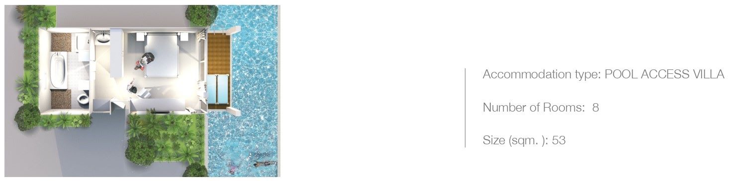 • 8 номеров Pool Access Villa (53 м², макс. 3 чел.).