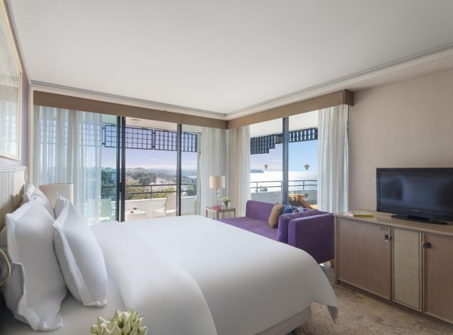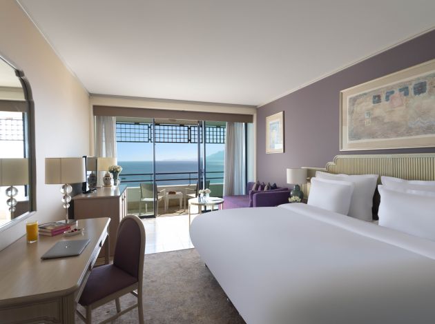 Двуспальная кровать king-size или 2 односпальные кровати (размер односпальной кровати – 100 х 200 см), диван, ванная комната с душем, балкон, панорамный вид на море, виртуальный тур по номеру;