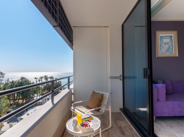 Двуспальная кровать king-size или 2 односпальные кровати (размер односпальной кровати – 100 х 200 см), 2 дивана (размер дивана – 80 х 190 см), ванная комната с душем, балкон, вид на море, виртуальный тур по номеру;