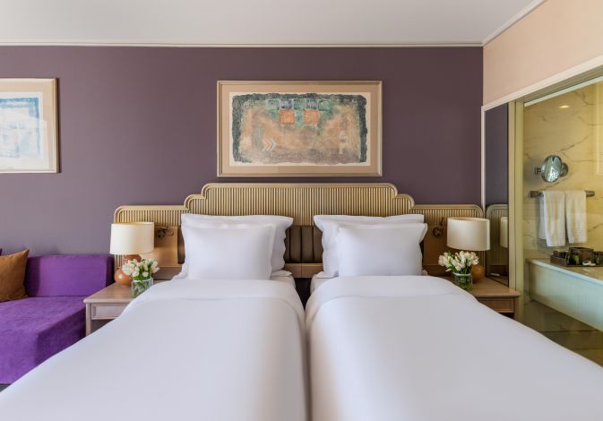 Двуспальная кровать king-size или 2 односпальные кровати (размер односпальной кровати – 100 х 200 см), 2 дивана (размер дивана – 80 х 190 см), ванная комната с душем, балкон, вид на городской ландшафт, виртуальный тур по номеру;