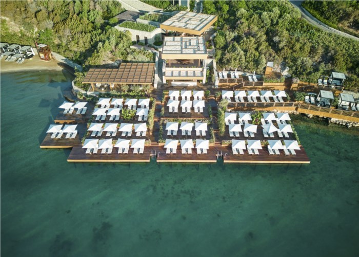 В корпусе Laguna, двухэтажный номер, 3 спальные комнаты (двуспальная кровать и 2 односпальные кровати – верхний этаж, двуспальная кровать – нижний этаж), гостиная комната с угловым диваном, гардеробная, 3 ванные комнаты с душем, 2 террасы, двухместный шезлонг на террасе, прямой выход с террасы к бассейну, вид на море. Дополнительные привилегии: завтрак в номере;