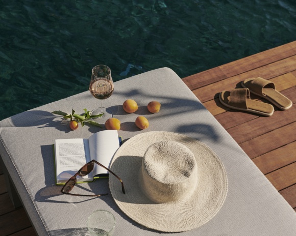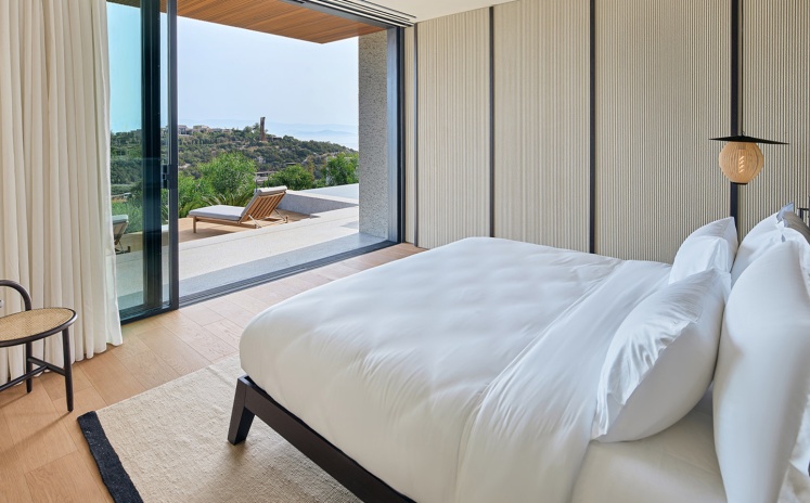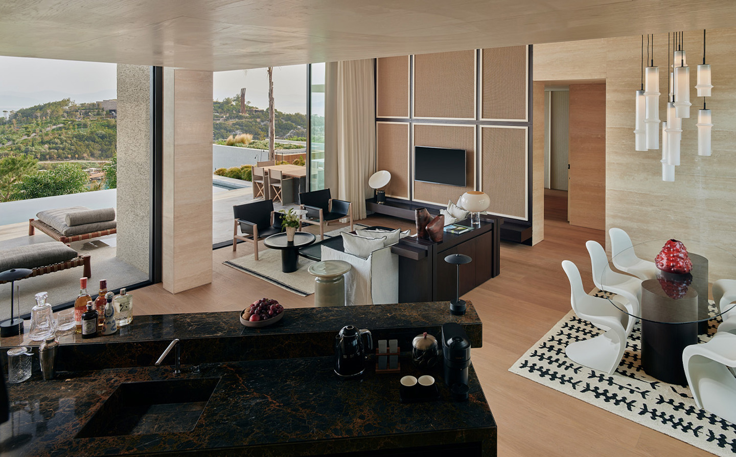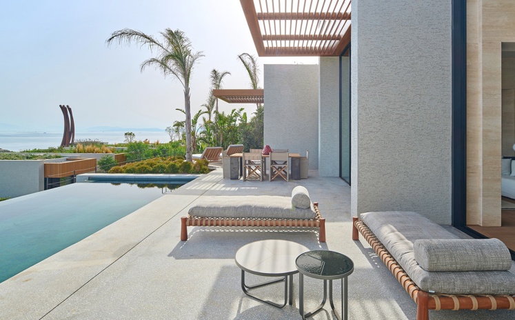 В корпусе Laguna, двуспальная кровать, гостиная зона с диваном-софа, гардеробная, ванная комната с двойным душем, терраса с двухместным шезлонгом, прямой выход с террасы к бассейну, вид на море. Дополнительные привилегии: завтрак в номере;