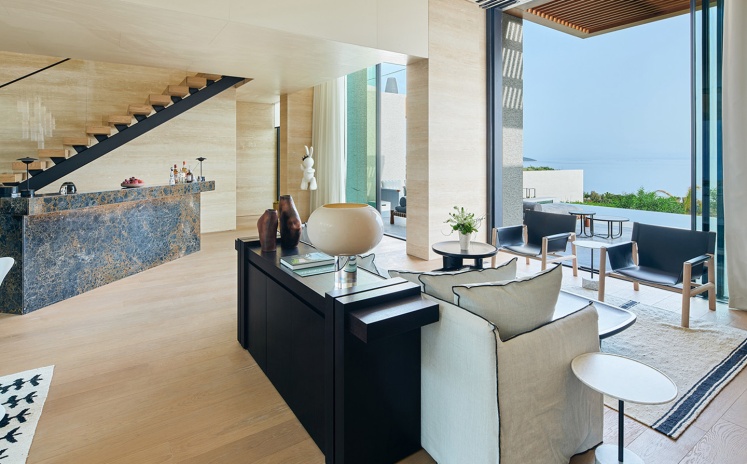 Вилла с видом на море, спальня с двуспальной кроватью на мезонине, гостиная и бар на первом этаже, ванная комната с ванной, тропический душ, терраса с зоной отдыха, частный бассейн-инфинити, макси-бар, ассорти свежих сезонных фруктов, выбрр премиальных орехов;