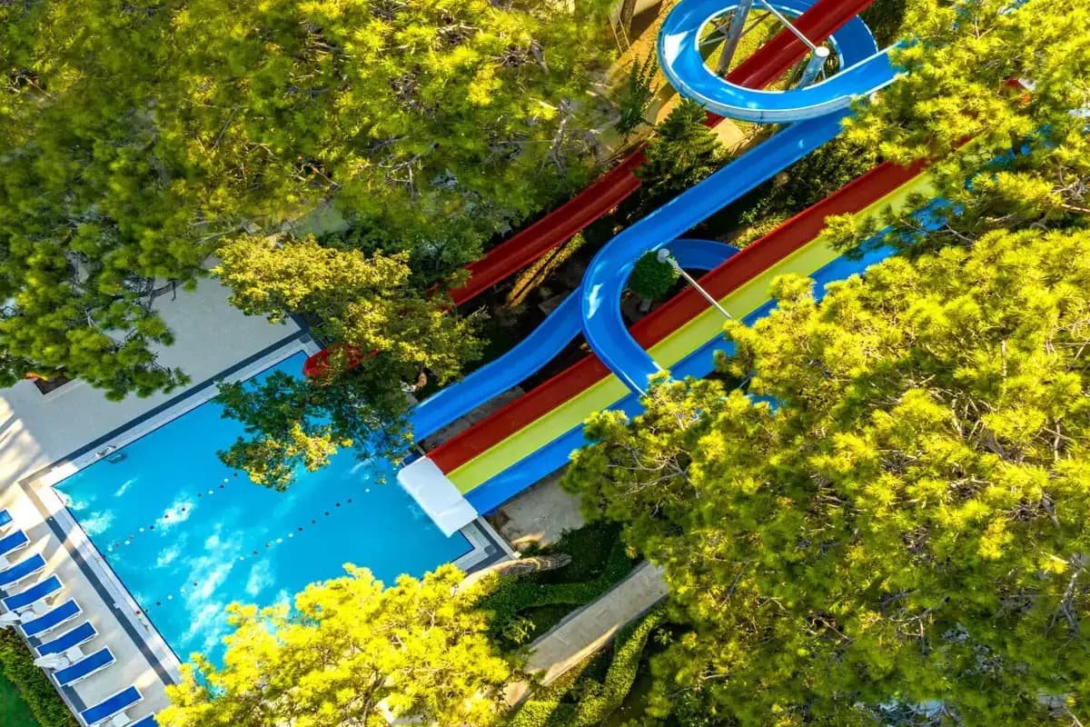 • 4 открытых бассейна: 783 м², 588 м², 300 м² (глубина – 140 см) и бассейн с водными горками (110 м²);