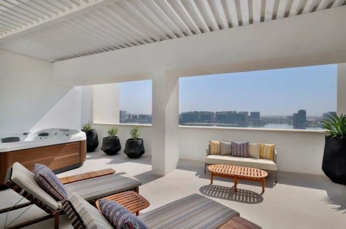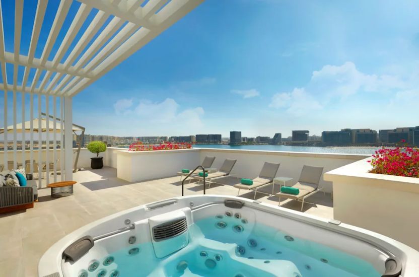 2 спальни: двуспальная кровать king-size и 2 раздельные кровати, 2 ванные комнаты с ванной и душем, гостиная комната, обеденная зона, мини-кухня, гостевая ванная комната, просторная терраса, джакузи на террасе, доступ в эксклюзивный лаунж;