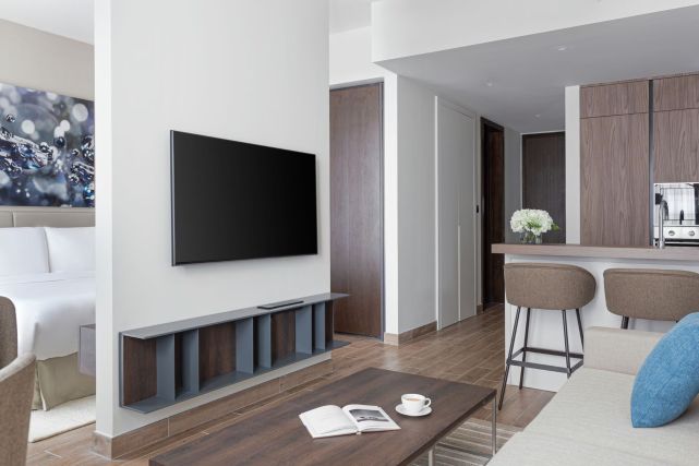 Отель предлагает 104 просторных апартамента с одной, двумя или тремя спальнями, каждый номер оснащён полностью оборудованной кухней. К услугам гостей: открытый бассейн-инфинити, бассейн для детей, тренажёрный зал, ресторан и конференц-зал.