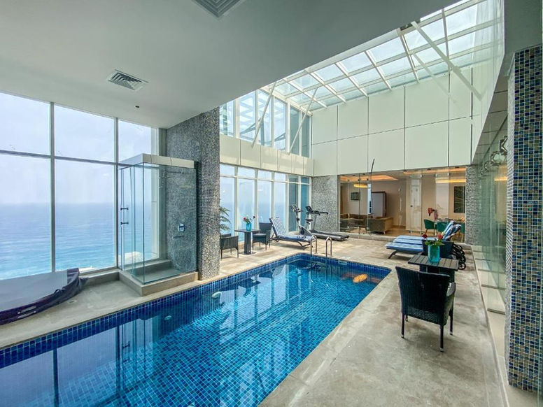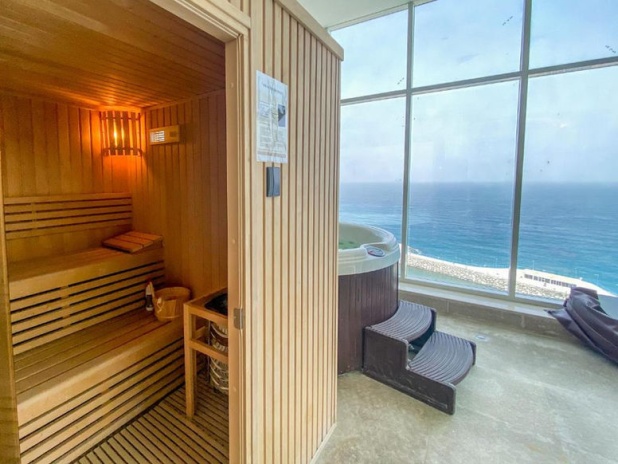 2 спальни: двуспальная и 2 односпальные кровати, гостиная комната с диванами и обеденным столом, мини-кухня с микроволной печью и кофемашной, сауна, джакузи, персональный крытый бассейн, тренажёры, вид на океан.