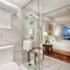 Номер с двуспальной кроватью, отдельная ванная комната с душевой кабиной и стеклянной стеной со шторой; вид на город;