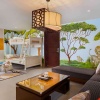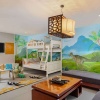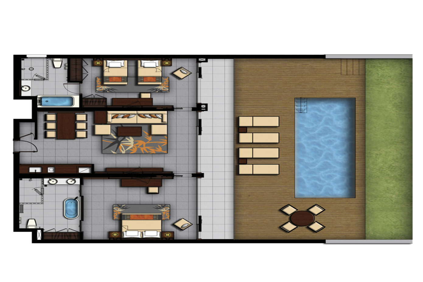 Люкс с 2-мя спальнями: одна – с двуспальной кроватью king size, вторая – с 2-мя односпальными кроватями; 2 ванные комнаты, каждая с ванной и душем; отдельная гостиная с зоной отдыха, обеденной зоной на 6 персон и мини-кухней с раковиной и микроволновой печью, меблированная терраса с обеденной зоной на открытом воздухе (на 4 персоны), частный бассейн, вид на территорию курорта; план номера;