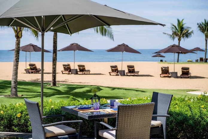 Просторный люкс на берегу моря: отдельная спальня с двуспальной кроватью king size, отдельная гостиная с обеденной зоной на 4 персоны и мини-кухней с раковиной и микроволновой печью, ванная комната с ванной и душем, меблированная терраса с обеденной зоной (на 4 персоны) на открытом воздухе и собственный бассейн, прямой выход на пляж, вид на море; план номера;