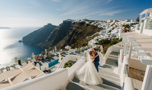 Доступны к бронированию свадебные пакеты на Санторини: символические церемонии от 980 €, официальные свадебные церемонии и венчание от 1200 €.