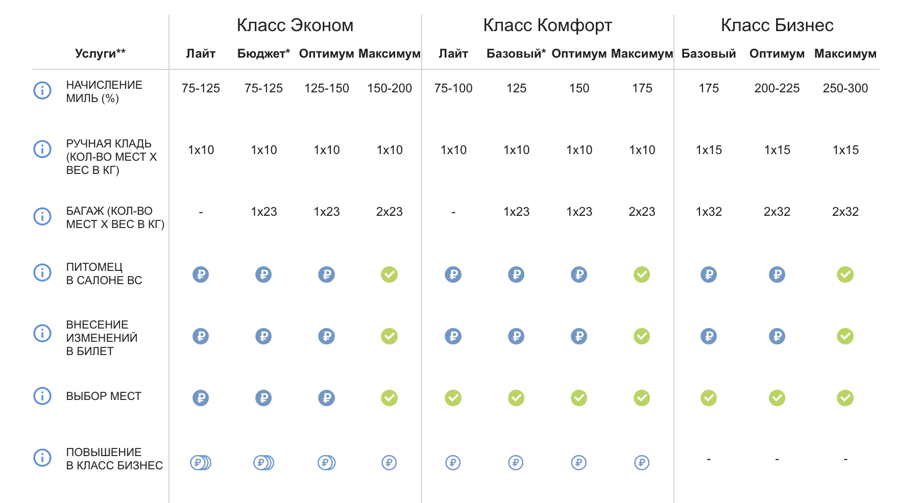 Класс «Эконом» – группы тарифов «Оптимум» и «Бюджет» (включая премиальные билеты эконом-класса программы «Аэрофлот Бонус»):