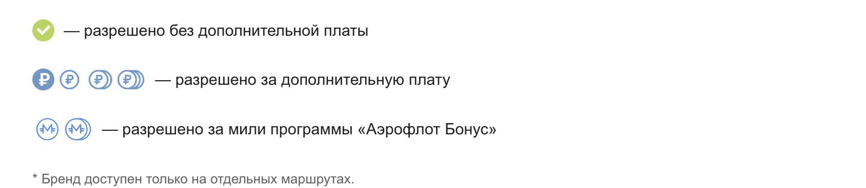 Однако на ряде направлений есть ограничения – онлайн-покупка багажа невозможна на рейсах, вылетающих из аэропортов: Гоа (GOI), Гуанчжоу (CAN), Дели (DEL), Дубая (DXB), Каира (CAI), Коломбо (CMB), Мале (MLE), Пекина (PEK), Маэ Сейшелы (SEZ), Хургады (HRG), Шанхая (PVG), Шарм-эль-Шейха (SSH);