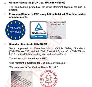 Сиденье автомобильного типа или любая его часть не должны иметь каких-либо явных признаков повреждения, и его можно закрепить только с помощью установленного поясного ремня авиационного сиденья. На сиденье автомобильного типа должна быть маркировка, указывающая, что оно одобрено для использования в авиации - см.фото.