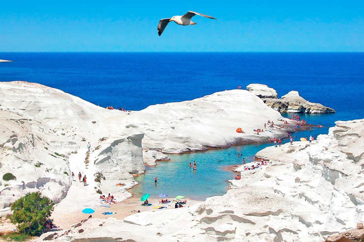 Если Красный пляж на Марсе, то Саракинико (Sarakiniko) – на Луне! Ослепительный пляж на острове Милос сформирован из выгоревшего на солнце белого известняка, а над его невероятными изгибами и бухтами трудились скульпторы: ветер и волны. Несложно понять, почему Саракинико – главный фаворит среди мест для отдыха у местных жителей.