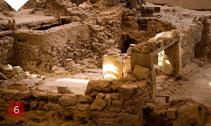 Санторини — это не только голубые купола церквей, пляжи с черным песком, закаты и красивейшие свадьбы. Еще здесь находится древний город Акротири, который засыпало песком 3500 лет тому назад. В 1960-х здесь начались раскопки: были обнаружены дома с великолепными фресками, мебелью, посудой, произведениями искусства. Нашли даже золотого козла, которого один из жителей прятал в подполе. При этом у историков до сих пор нет ответа, как спаслись жители Акротири от разрушительного землетрясения — при раскопках не было обнаружено ни человеческих останков, ни останков домашних животных.
