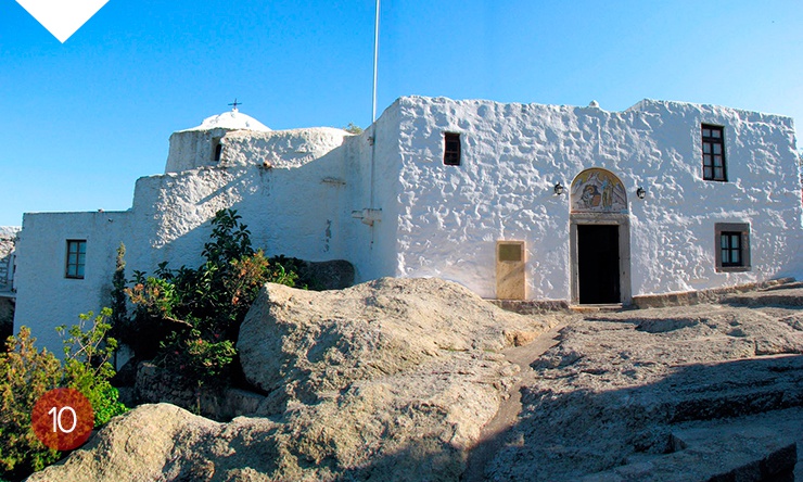 Белые дома поднимаются от моря вверх по скалистым , заросшим оливой слонам к величественным стенам действующего замка-монастыря с фресками XII века. Монастырь стоит над пещерой Апокалипсиса, где Иоанн Богослов получил Откровение и продиктовал его своему ученику.