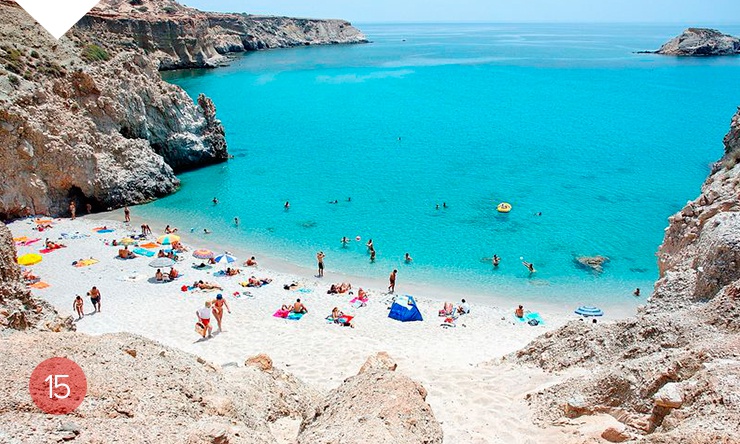 Таких пляжей, как на острове Милос, нет нигде. Их больше 70, все они пригодны для купания, и ни один не похож на другой. Вода — всех оттенков, от синего до зеленого. Песок — от нежного до кварцевого. Есть пляжи красные, серые и абсолютно золотые. Самый удивительный — Саракинико: песка здесь нет, у бирюзовой воды застыли белоснежные камни. В нескольких километрах есть и другое чудо природы — пещера Папафранка, старинное убежище пиратов. Добраться сюда можно только на лодке, а внутри кажется, что плывешь по анфиладам горного дворца.