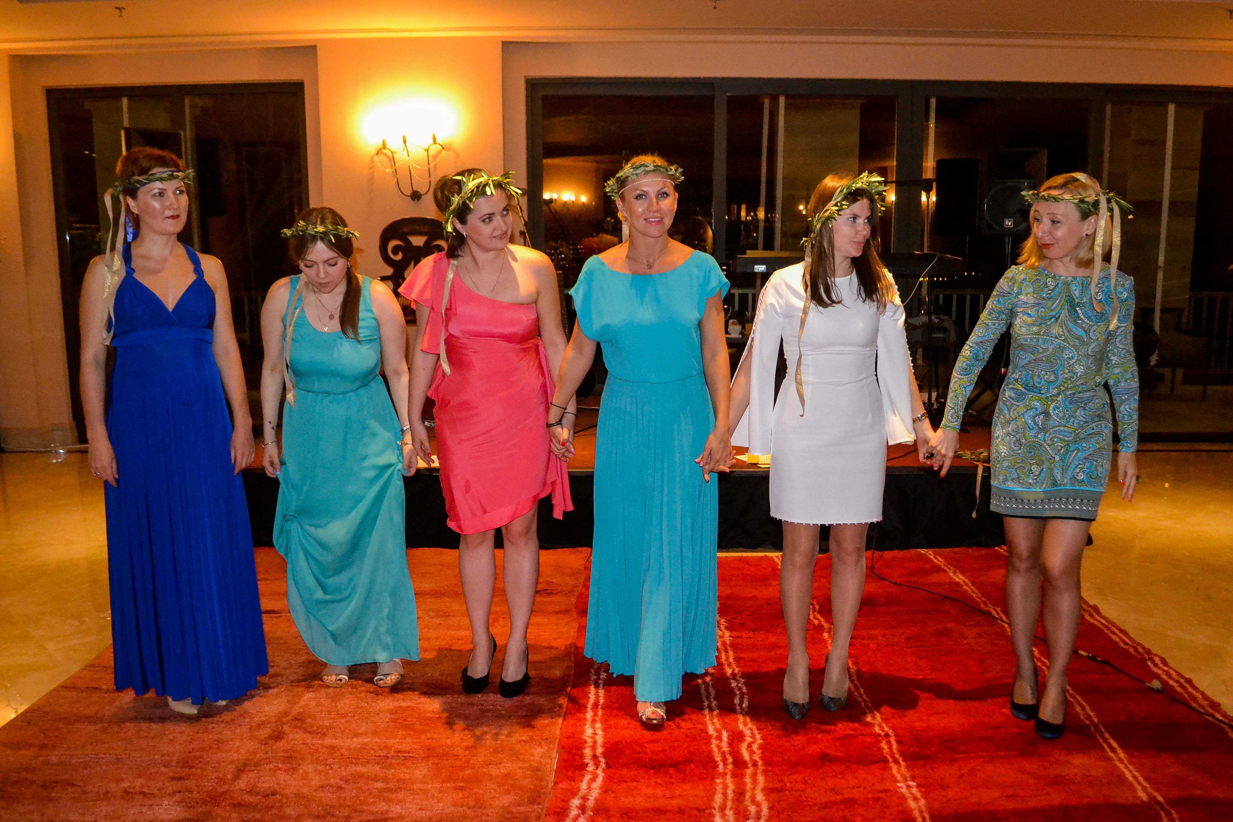 Два дня интенсивной работы завершились тематической вечеринкой, которая была посвящена олимпийским богам и античным героям. Дресс-код при этом предполагал яркие цвета. Как известно, античные скульптуры из белого мрамора ранее были ярко раскрашены, о чем не так давно поведали миру результаты исследований.